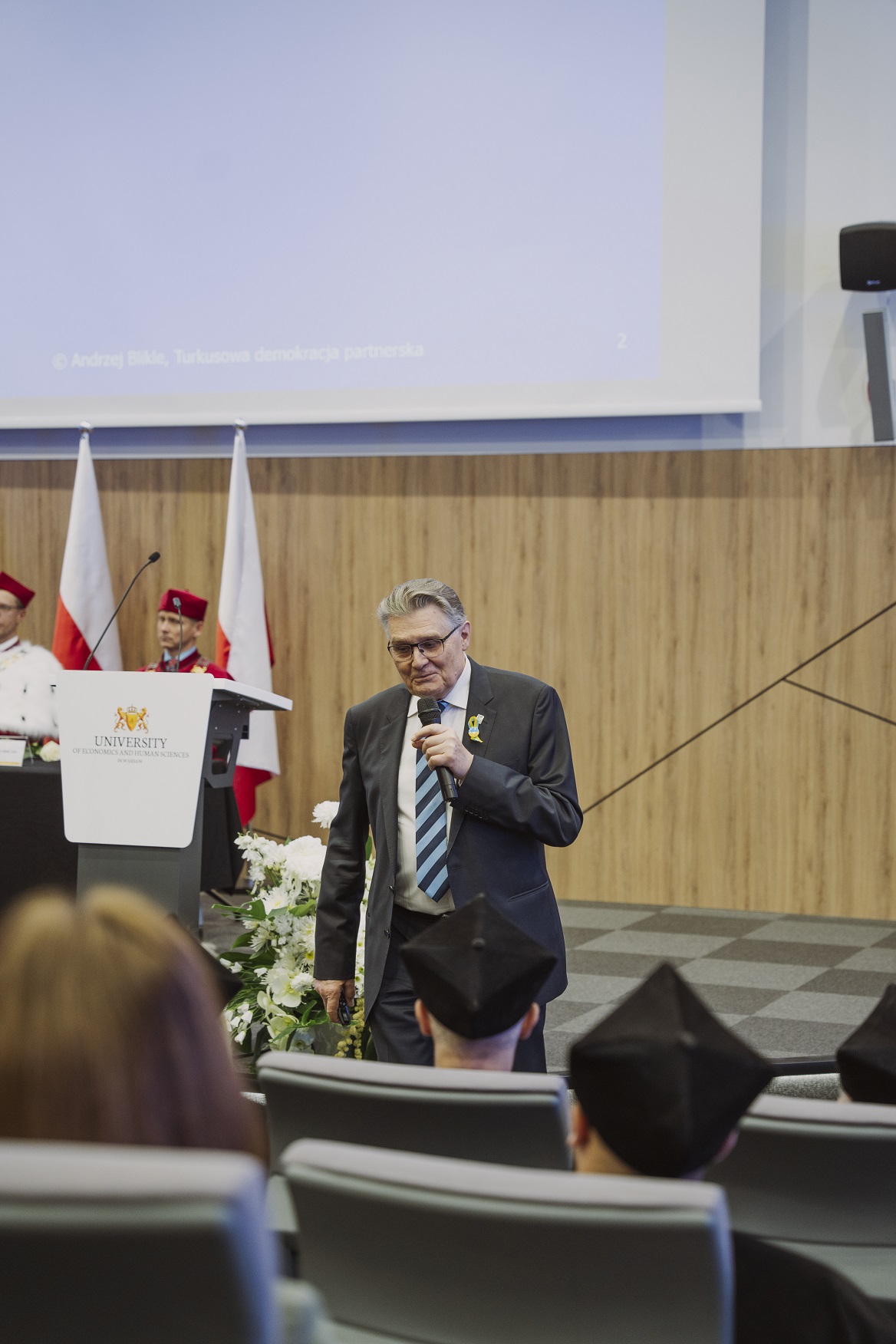 Wykład inauguracyjny pt. „Turkusowa demokracja partnerska” wygłosił Pan prof. Andrzej Blikle – polski informatyk, profesor nauk matematycznych, członek Rady Języka Polskiego, pracownik naukowy. Podczas wykładu inauguracyjnego dowiedzieliśmy się, że w turkusowej organizacji zaufanie jest kluczowe, ale nie można go wymusić ani deklarować. Zaufanie może istnieć tylko wtedy, gdy wszyscy pracownicy czują się odpowiedzialni za organizację oraz jej działanie.