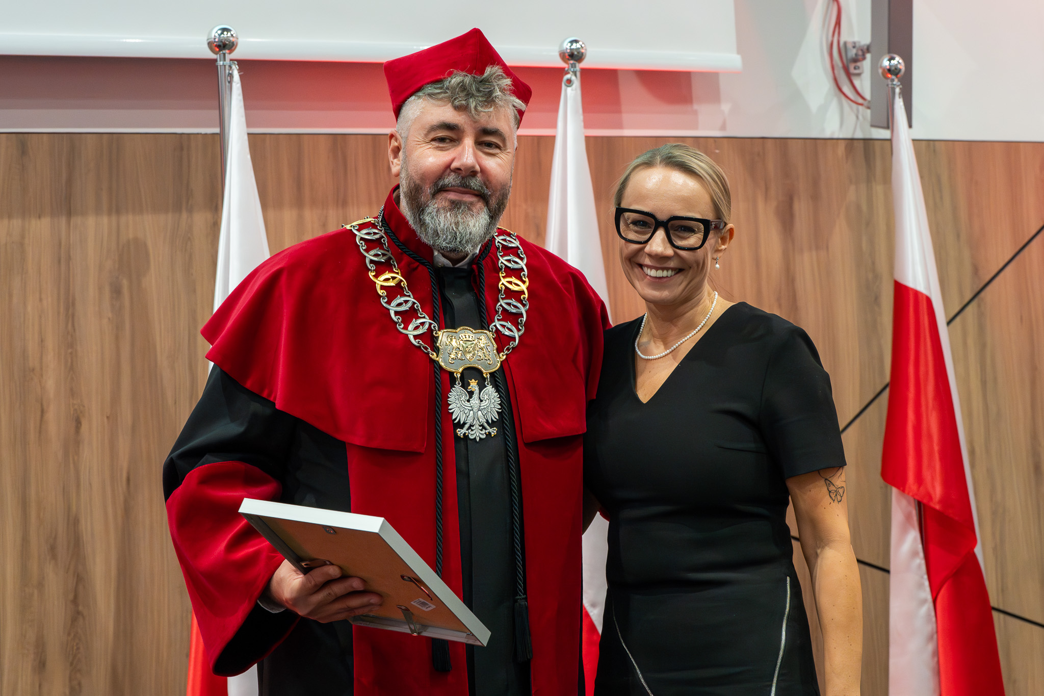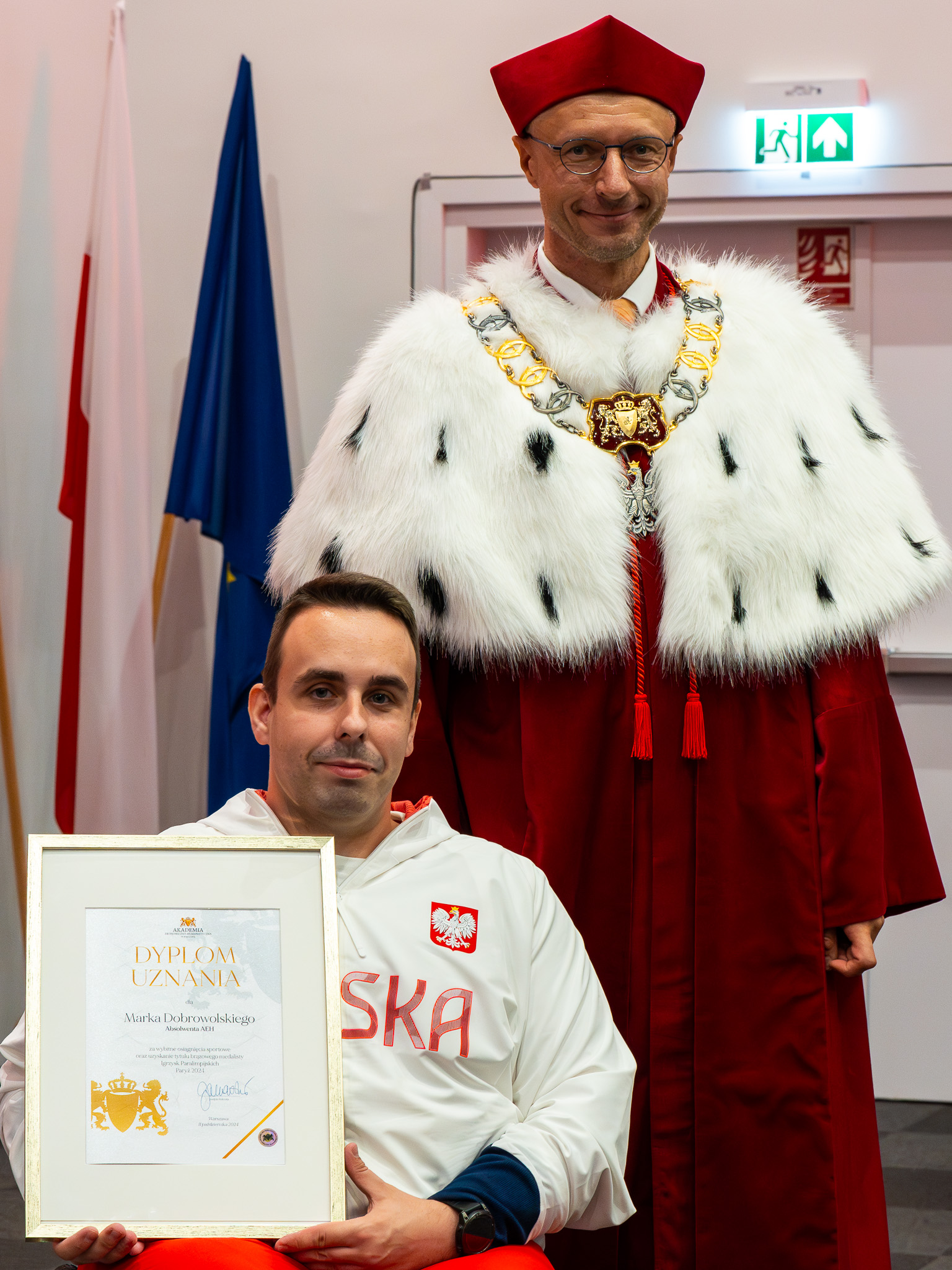 Jego Magnificencja w trakcie swojego przemówienia wręczył także dyplom w ramach podziękowania naszemu studentowi Zarządzania – Markowi Dobrowolskiemu za wybitne osiągnięcie jakim było uzyskanie brązowego medalu na tegorocznej paralimpiadzie w Paryżu, w strzelaniu z karabinu dowolnego na 50 metrów w trzech postawach.