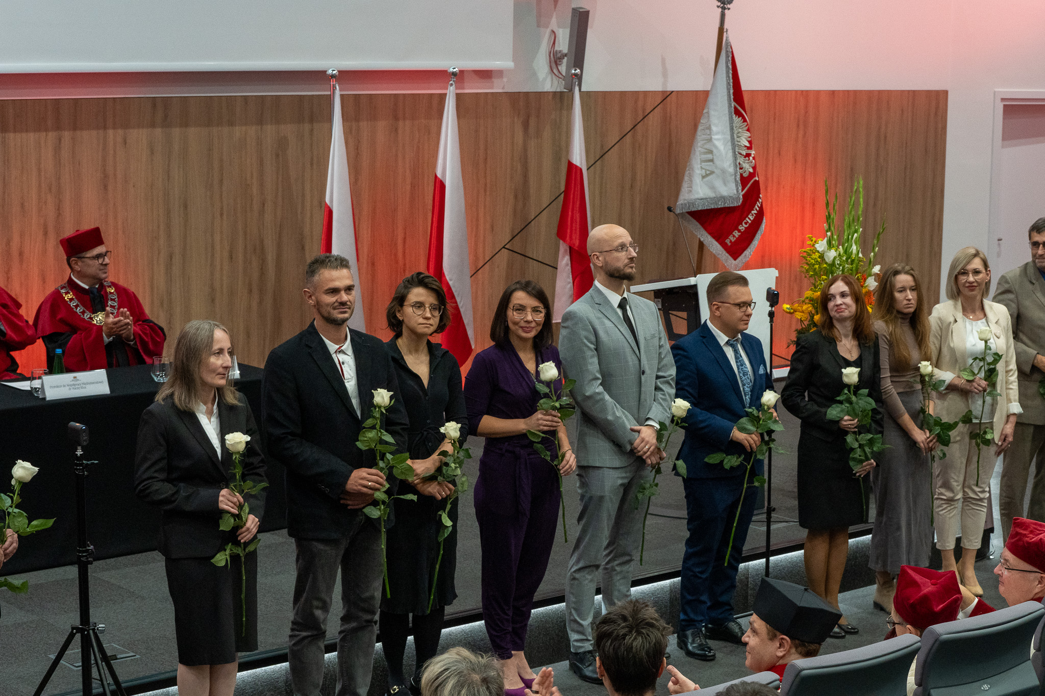 Jego Magnificencja Rektor prof. Konrad Janowski wraz z Przewodniczącym Rady Naukowej Mieczysławem Plopą i zarazem promotorem pracy doktorskiej powitali w gronie nowych doktorów Akademii dr Katarzynę Awruk. Świeżo wypromowanej Pani Doktor dyplom od Ministra Nauki wręczył Prorektor ds. Nauki – prof. Marcin Staniewski.