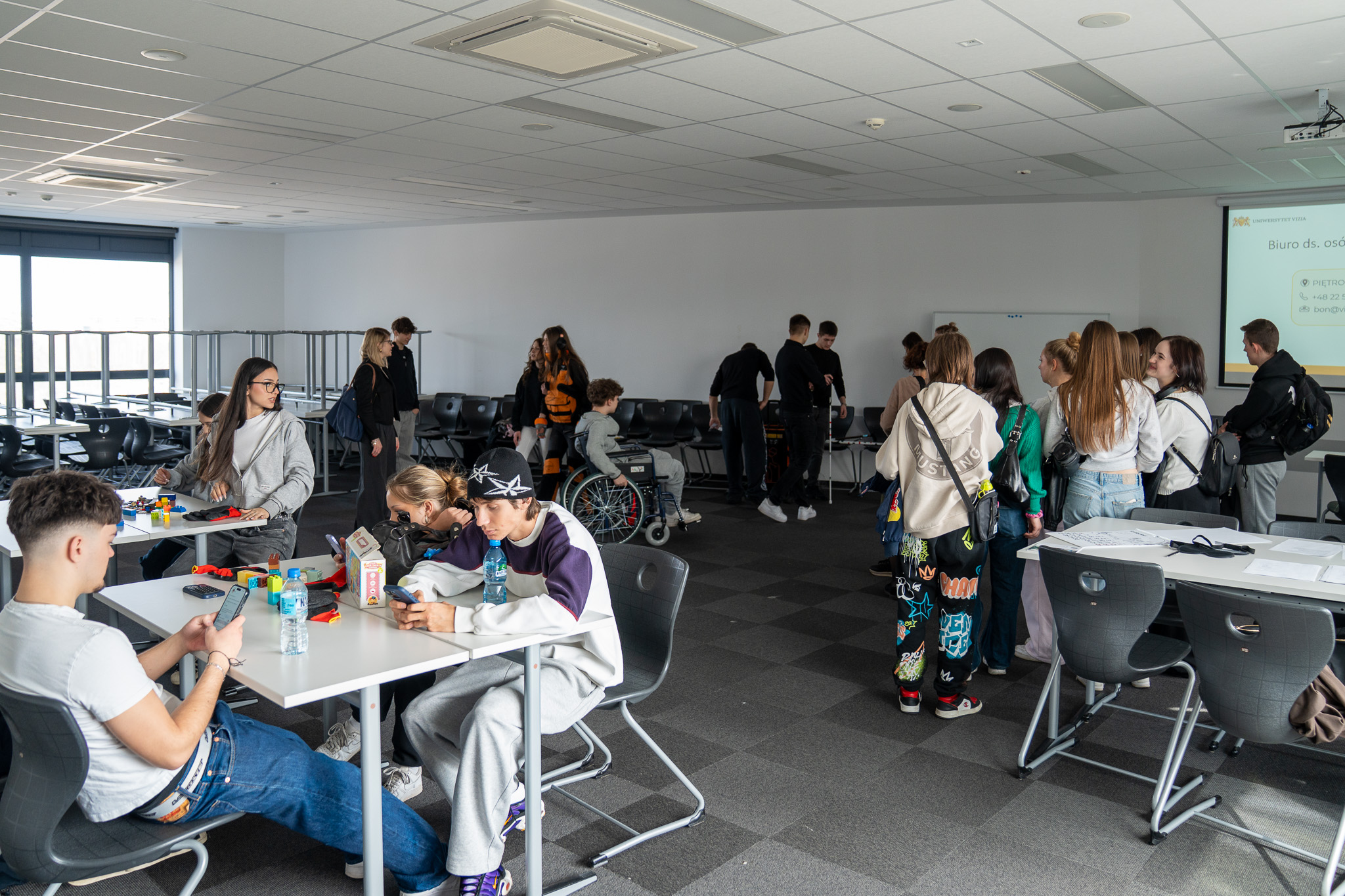 W ramach wydarzenia została przygotowana „Sala Zmysłów”, w której wykorzystano symulatory prezentujące codzienne wyzwania osób o różnych potrzebach. Uczestnicy sprawdzali ograniczenia motoryczne w specjalnym kombinezonie symulującym starość oraz wykonywali zadania w okularach imitujących wady widzenia. Przygotowaliśmy tor przeszkód do pokonania na wózku inwalidzkim oraz trasę z laską dla niewidomych. Dostępne były także rękawiczki zmieniające precyzję dłoni, co pozwoliło sprawdzić zmiany w motoryce małej. Stanowiska te służyły prezentacji technologii wspierających dostępność edukacji.