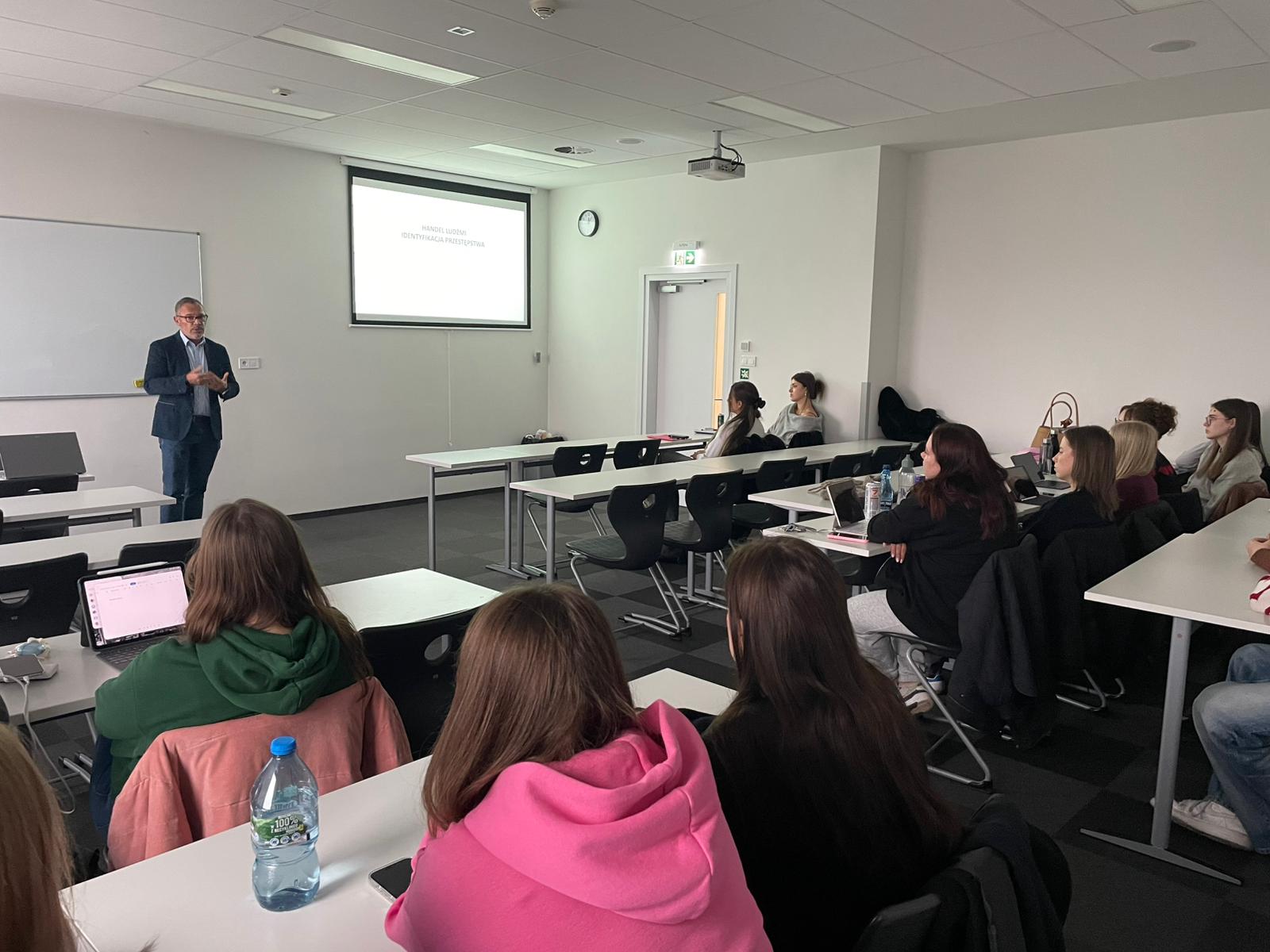 Gośćmi uczelni byli Pani Prezes Fundacji Agata Witkowska oraz mł. insp. w st. spocz. Tomasz Szyda, wieloletni naczelnik Wydziału do walki z Handlem Ludźmi Komendy Głównej Policji. Zajęcia odbyły się w dwóch grupach i miały formę łączącą wykład z analizą praktycznych przypadków.