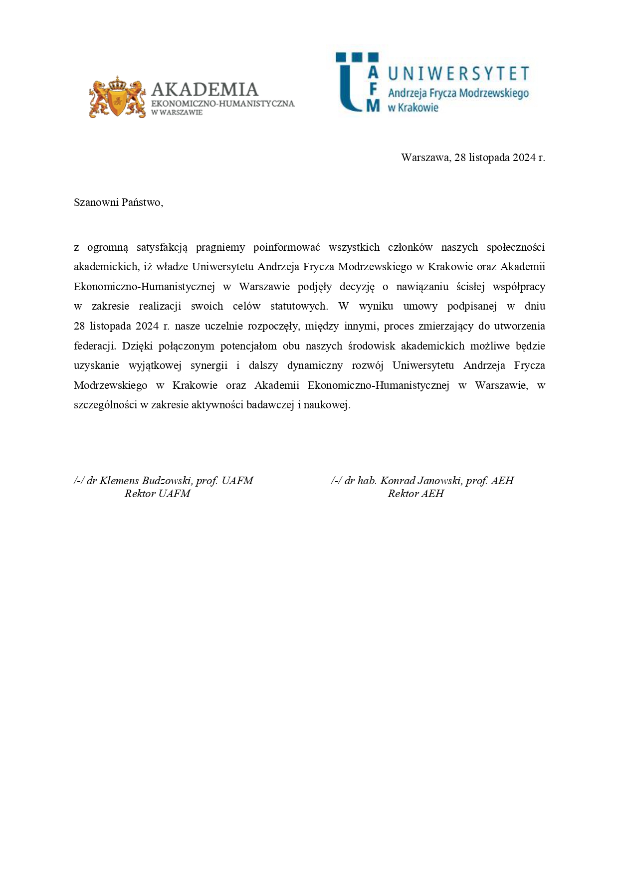 Z satysfakcją informujemy, że w dniu 28 listopada 2024 r. władze Uniwersytetu Andrzeja Frycza Modrzewskiego w Krakowie oraz Akademii Ekonomiczno-Humanistycznej w Warszawie podjęły decyzję o nawiązaniu ścisłej współpracy w zakresie realizacji swoich celów statutowych.